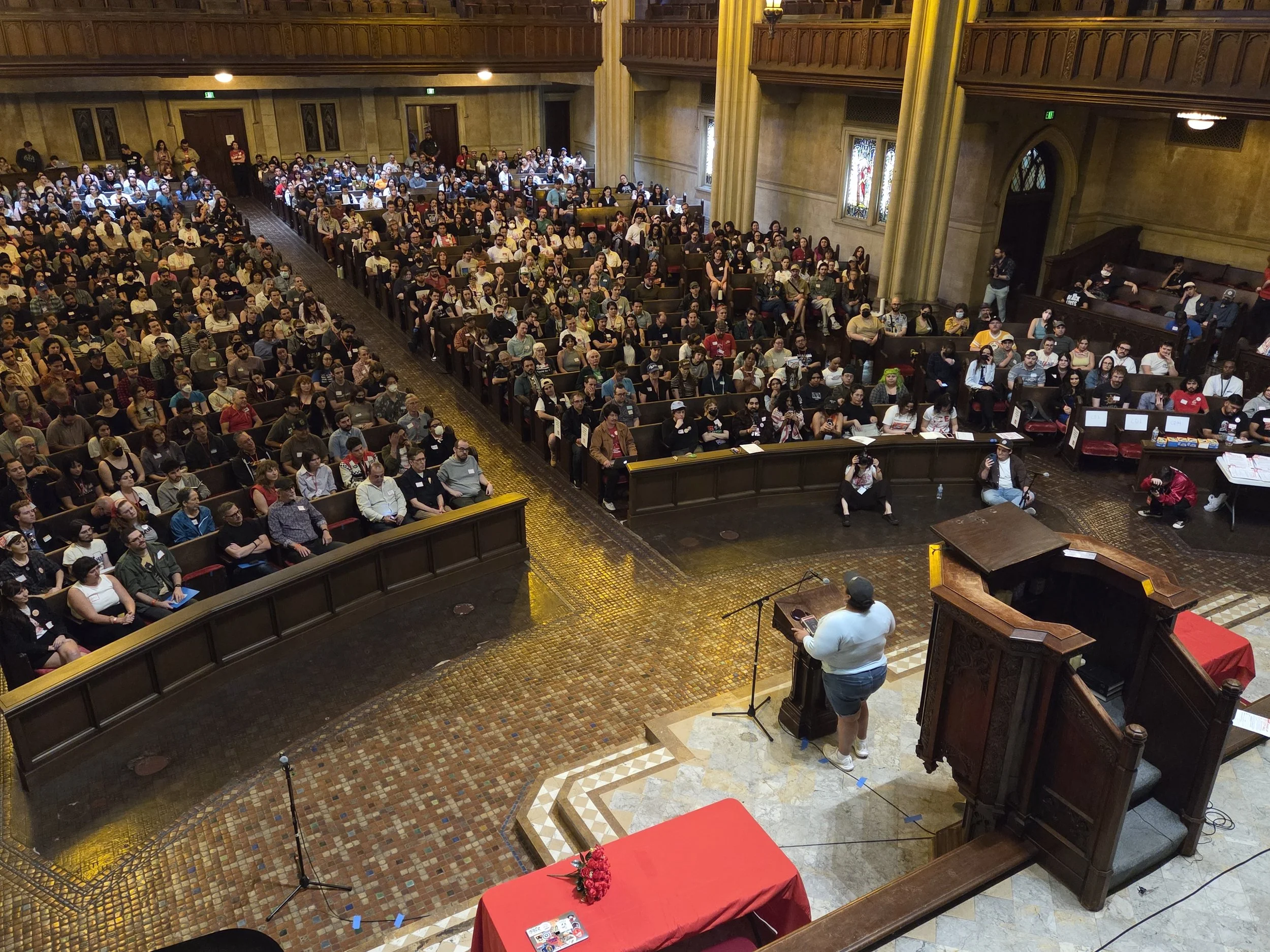 Certain members met this idea with skepticism. Others doubted the interest of that many people for a meeting or said they had no idea where we could find a venue to hold that many members. Despite that, the excitement over the meeting only continued to grow. Five days before the meeting we already met our goal of 800 RSVPs, meaning we were on track to surpass the attendance of the post-Zohran November 2025 chapter meeting. Four days before, we sailed past 1,000 RSVPS. The day of the meeting, we topped out at almost 1,300 RSVPs, and had almost 800 attendees.