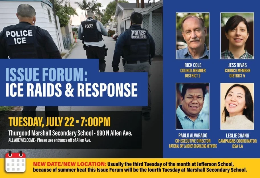 First, our coalition is broad and tight-knit. Coalition for Humane Immigrants Rights of Los Angeles (CHIRLA), National Day Laborer Organizing Network (NDLON), Union del Barrio, and others have taught DSA-LA how to organize, how to exercise their rights, and how to mobilize. Our coalition also includes tenants’ organizations and unions, such as Alliance of Californians for Community Empowerment (ACCE), Los Angeles Alliance for a New Economy (LAANE), UNITE HERE, UTLA, Los Angeles Tenants Union (LATU), and UAW. Our relationships go beyond inter-organizational collaboration: many DSA-LA members and leaders are also members and leaders in these organizations. The ICE effort to spread anti-immigrant racism in LA was stymied by the breadth of our coalition.