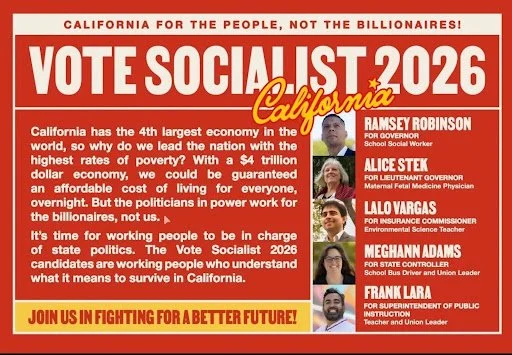 In California, the “Vote Socialist” slate is being pushed by the Party of Socialism and Liberation (PSL) and the Peace and Freedom Party (PFP)—both of which are riding the wave of Zohran Mamdani’s victory in New York City to increase their presence. The PSL and the PFP, both of which have never won a contested election in recent memory, continue to push a third party and so-called “agitational” electoral model with the performative Vote Socialist slate. Their strategy relies on socialist identitarianism, (i.e. vote for me because I am the only “real” socialist running, etc.) instead of attaching the needs of the working class to the platform of a candidate and movement the way Mamdani and NYC-DSA have.