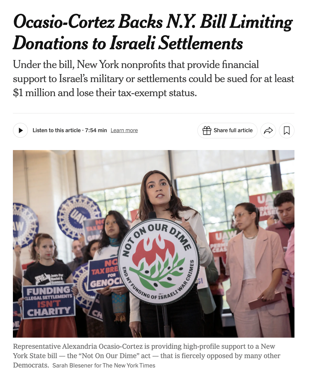 Ocasio-Cortez is still a member of NYC-DSA and endorsed by the chapter, and has been moving toward more collaboration with the chapter. In terms of policy, she has introduced federal social housing legislation tied to NYC-DSA’s statewide social housing initiative, and endorsed Zohran Mamdani’s pro-Palestine “Not on Our Dime” legislation at a press conference with United Auto Workers Region 9A and many other NYC-DSA elected officials. The national non-endorsement has not had a noticeable impact on her relationship with the chapter, and she recently headlined a recruitment event (a YouTube recording reached over 50K views).